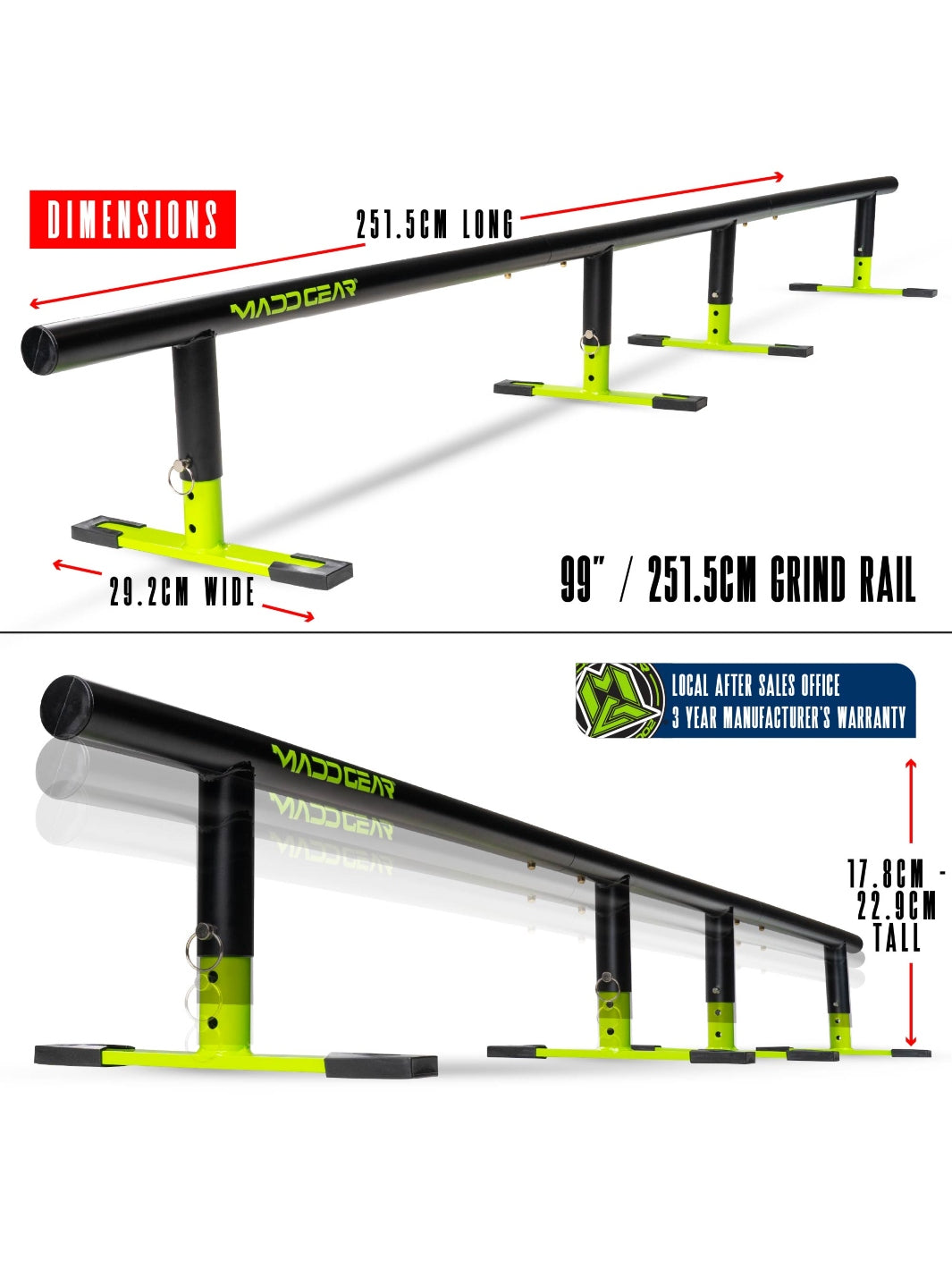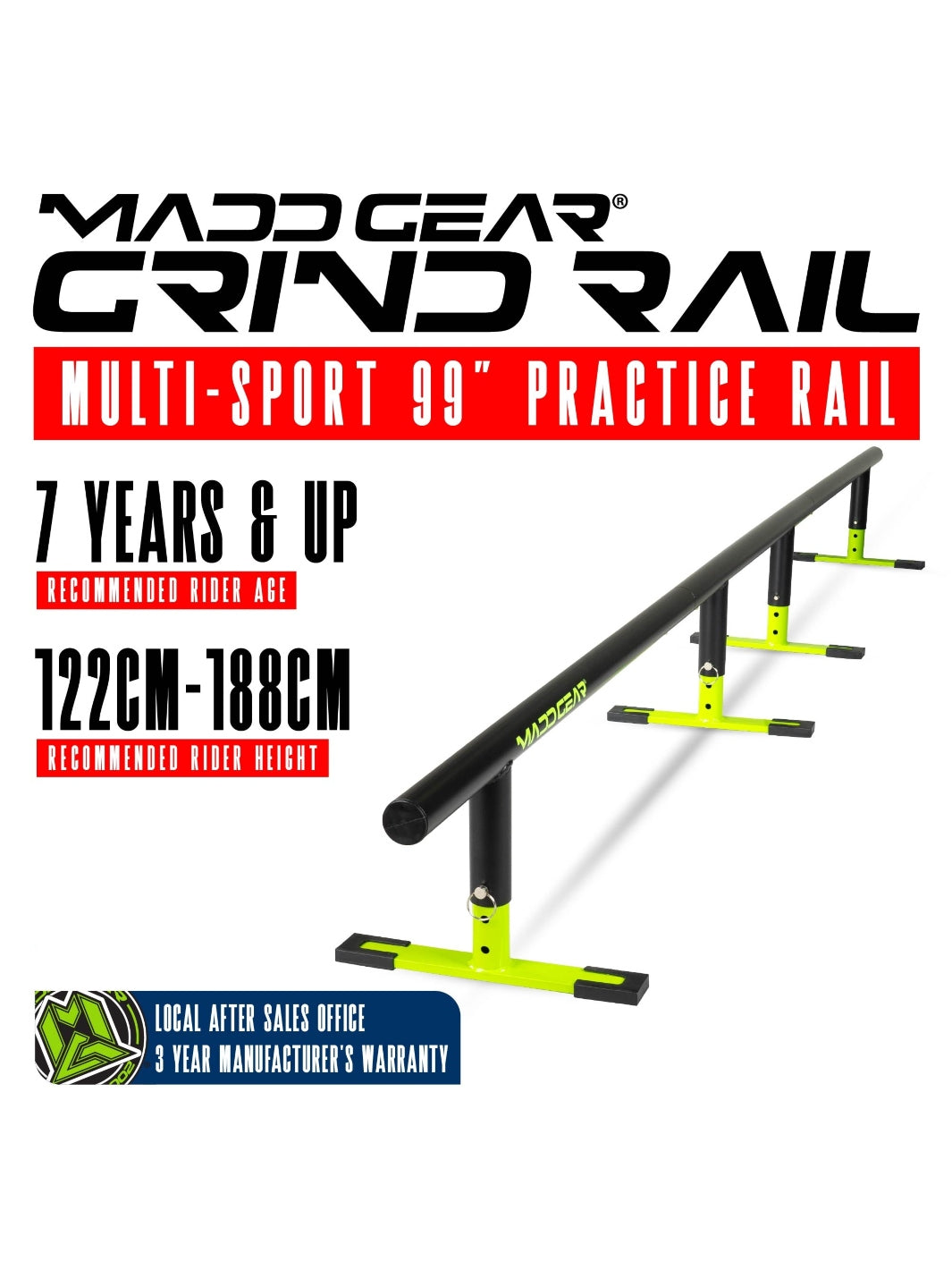The Madd Gear Flat-Bar Grind Rail comes in a shorter 55" beginner rail and a 99" rail for dialing in those combo tricks. Wide adjustable legs for stability and easy progression! Bring the skatepark to your own yard.