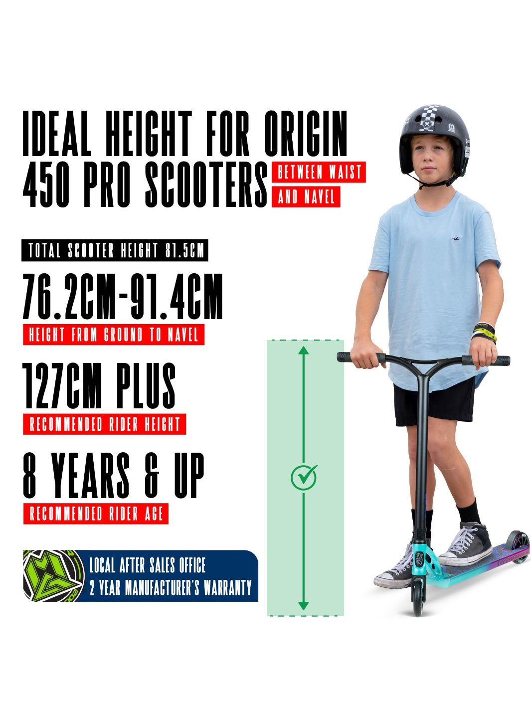 The Origin 450 is a compact but high-performance park scooter, designed for younger riders who are already riding at an advanced level. Best suited to riders around 127cm tall and up, it delivers pro-level strength in a smaller, more manageable size.