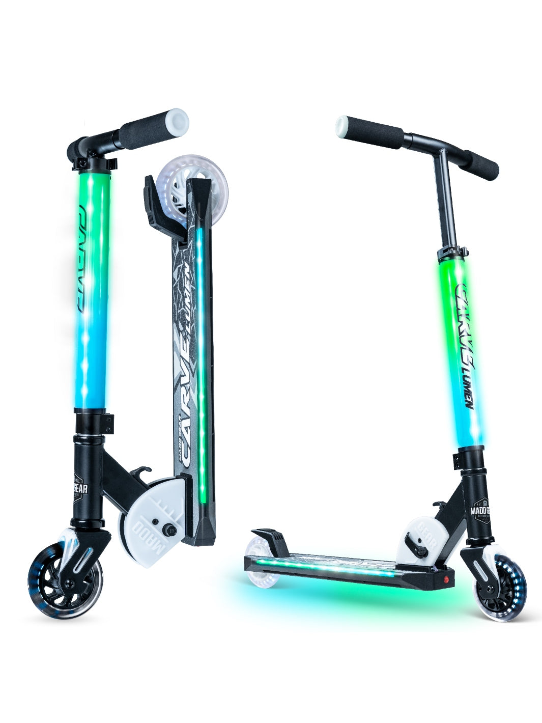 The Madd Gear Carve Lumen Light-Up Folding Scooter features an amazing array of LED lights with a whopping 20 different selectable functions! The fun is endless as you light-up your path in any color or flashing combination you can dream of.