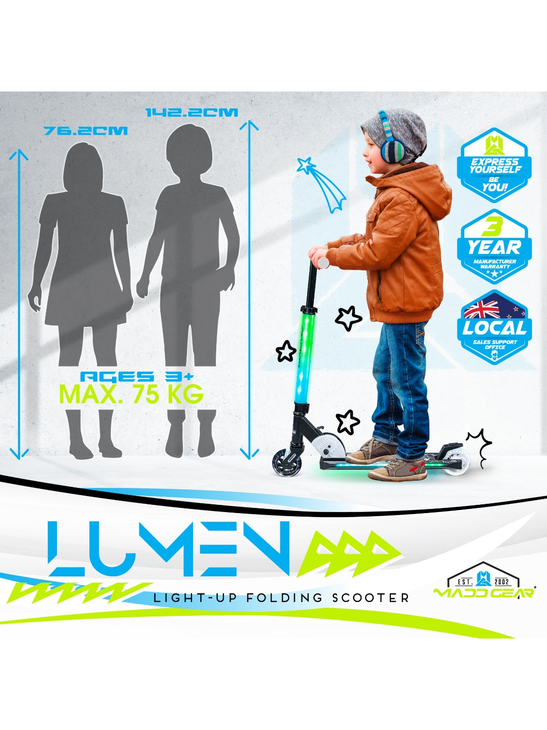 The Madd Gear Lumen Light-Up Folding Scooter is the ultimate rolling lightshow! The fun is endless as you light-up your path in any color or flashing combination you can dream of! The Madd Gear Carve Lumen Light-Up Folding Scooter features an amazing array of LED lights with a whopping 20 different selectable functions! Not content with just three RGB colors, the Carve Lumen features 7 different colors of the rainbow making for one of the most vibrant and fun scooters on the market! The Madd Gear Carve Lumen Scooter features unisex color combinations and is ready for takeoff, ideal for children aged 3 years and up.