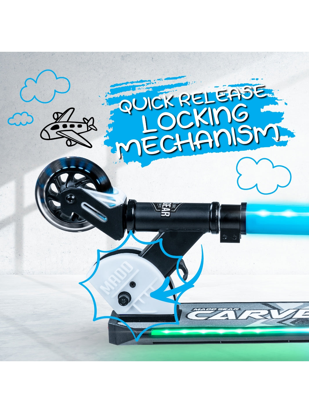 The Carve Lumen scooter has a customizable three stage height adjustable eclipse handlebar embedded with bright LED lights topped with comfortable non-slip handlebar grips. The Madd Gear Easy-Fold system makes storage and transport a breeze and is ready to ride in seconds!